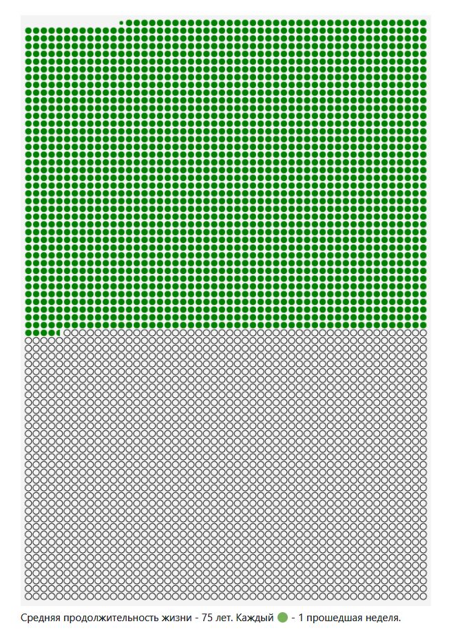 Каждые 7 дней скрипт будет закрашивать один кружочек, неумолимо уменьшая оставшееся время. Может это убедит кого-то из нас переосмыслить свою жизнь, подтолкнет к действию, научит ценить каждую минуту, сместит акценты. Или вы просто посмеётесь над моей наивностью и продолжите лежать на диване…